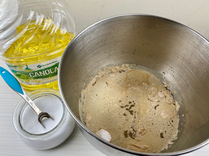 - ADD hot water, yeast and sugar to a KitchenAid mixing bowl or large mixing bowl. Pour in the oil. Add the flour and salt. Mix well, adding more flour if necessary to make a smooth, workable dough that pulls away from the mixing bowl. Mix for a few minutes.