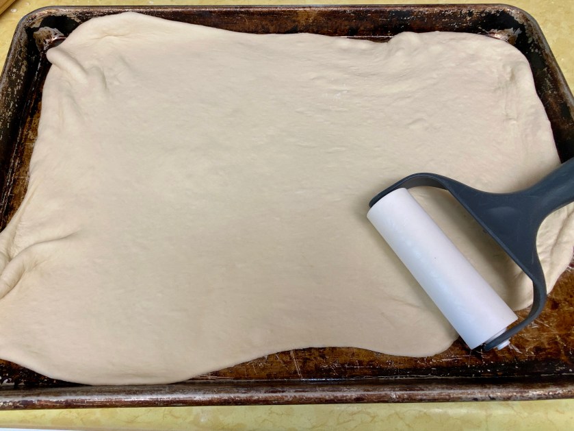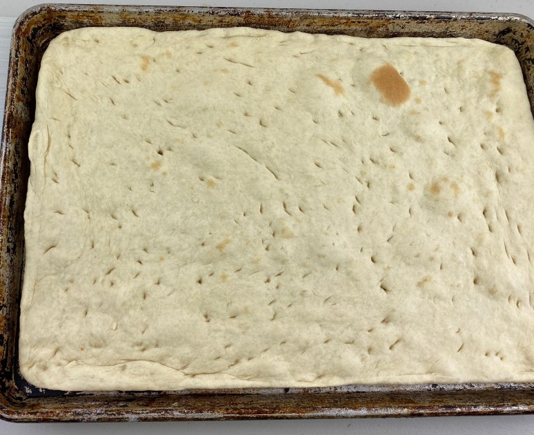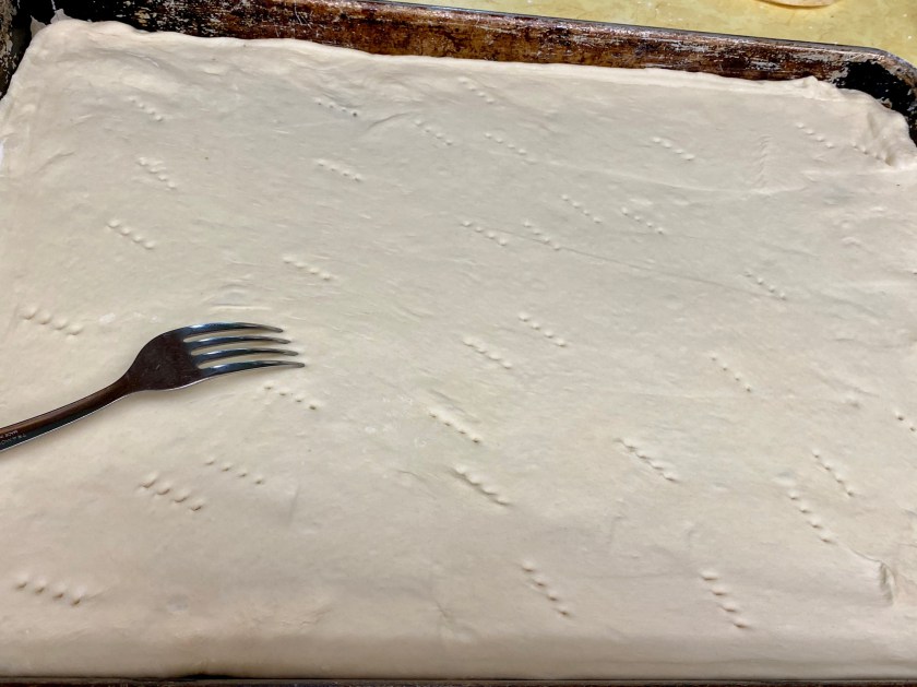 - DIVIDE the dough in to 2 pieces. Working with one piece at time, use a rolling pin to shape the dough and place in pan. Poke the dough with a fork.