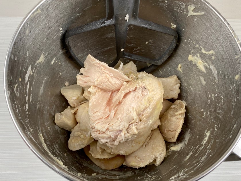 - RELEASE the pressure on the chicken. Using tongs or a fork, place the chicken in the same KitchenAid bowl used for the dough. IT IS OKAY IF THE CHICKEN IS STILL UNDERCOOKED, IT WILL FINISH COOKING AS THE PIZZA BAKES. Set the chicken broth aside and cool it for another use. Using the KitchenAid paddle, mix the chicken till it shreds. Add crispy fried onions, mix briefly to combine.