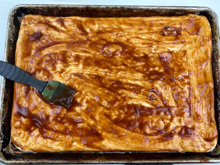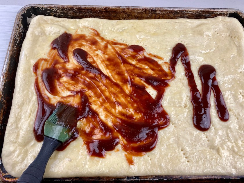 Butter the crust then smear on BBQ sauce