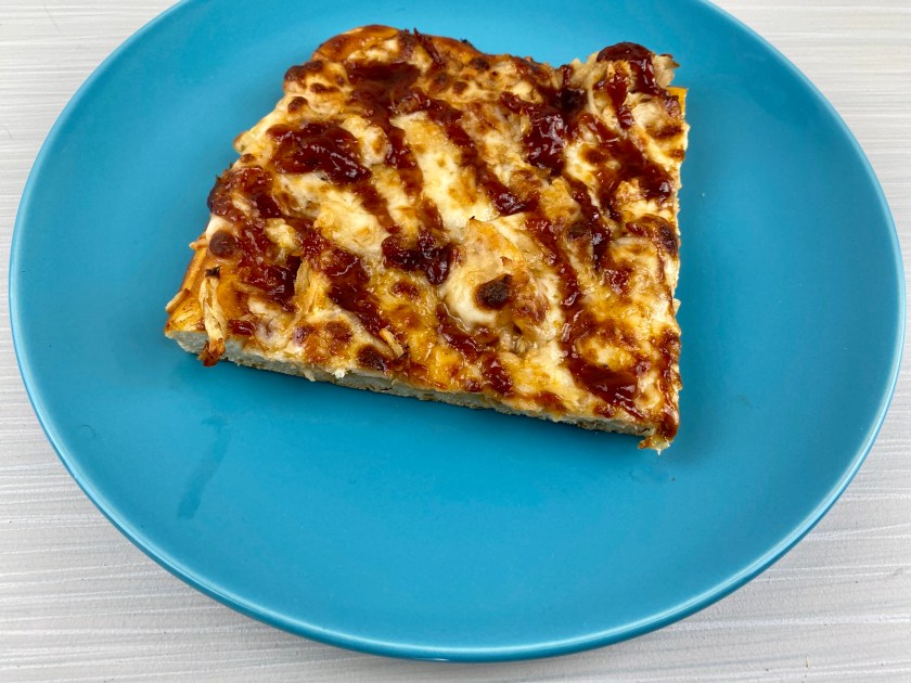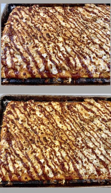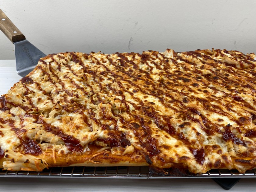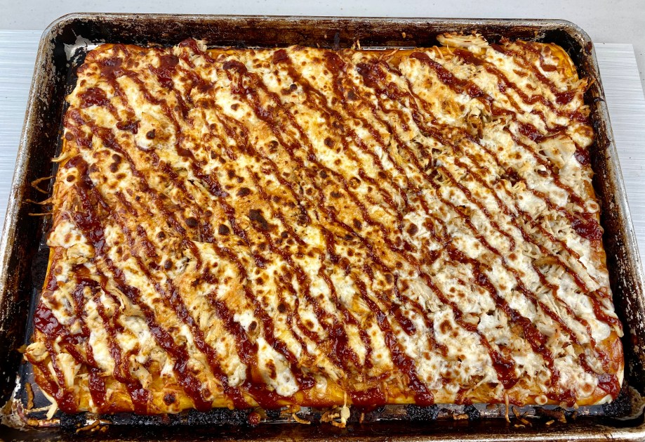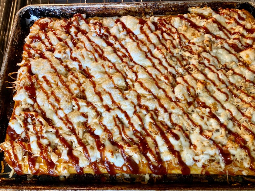 BBQ sauce & two kinds of cheese blanket a delicious layer of tender chicken. The no-raise pizza dough recipe can be easily halved yielding a 12×18 pan.