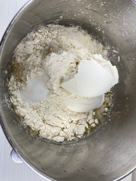 - SPRINKLE the work surface with flour. Scrape the dough out of the mixing bowl. Set the mixing bowl aside to use for shredding the chicken.