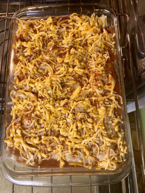 - GENTLY roll the filled tortilla shells and and place them, seam side down, in the pan. POUR the remaining sauce over the enchiladas and sprinkle with cheese.