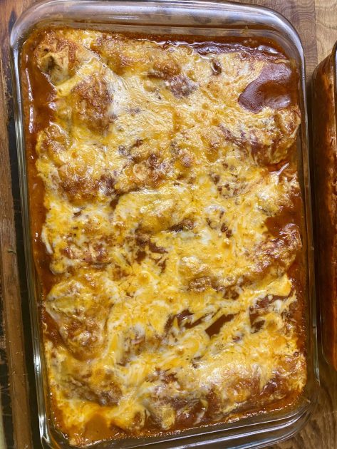 - Add 1 cup of enchilada sauce to the baking pan. SPREAD the sauce to cover the bottom of the pan.