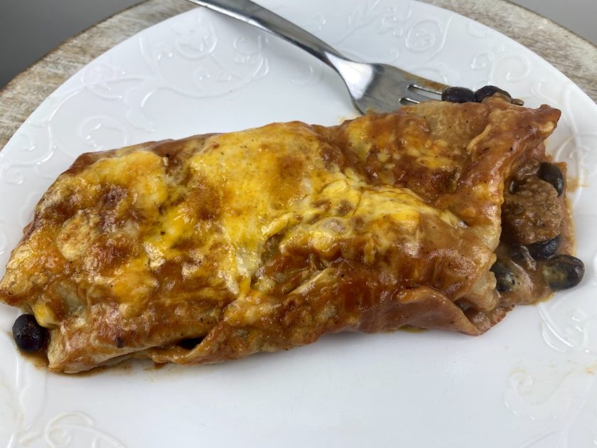- BROWN the beef in a medium-size skillet. Drain any excess fat from the skillet if needed. Add beans, chilies and 1/2 cup of enchilada sauce to the to the beef. Heat throughly. Use a spatula to divide meat into 6 or 8 portions (depending on tortilla size) in the pan.