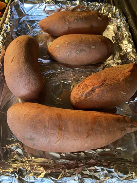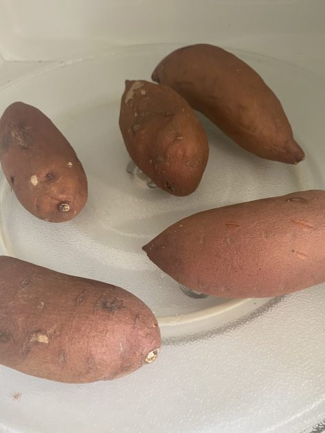- WASH sweet potatoes and poke a few fork holes in each potato.