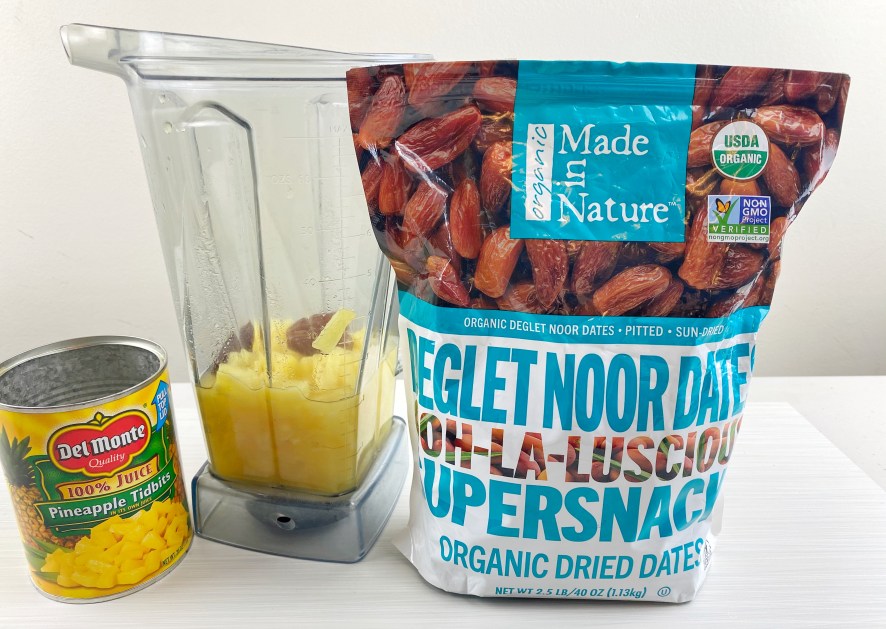 - MAKE the dressing by adding the pineapple and dates to the blender. Blend on low speed then high speed until smooth.