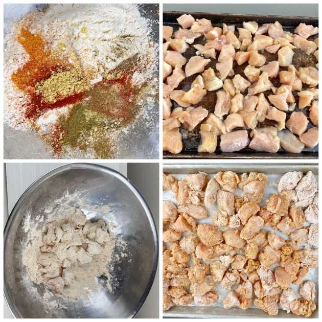 - ARRANGE the coated chicken on a large baking sheet. Divide the chicken into 4 or 5 batches.
