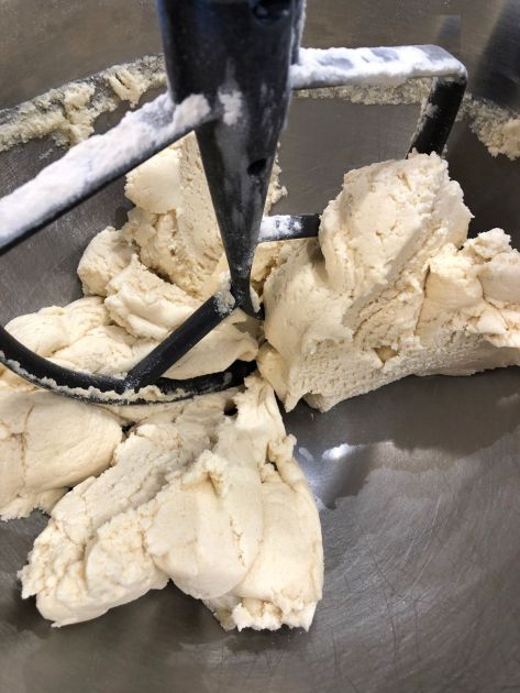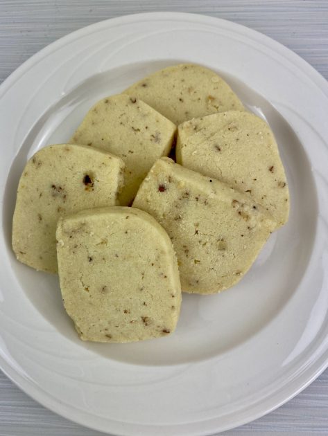 - Cream the butter, sugar and flavorings together using a hand or stand mixer. Very slowly add the flour and pecans.