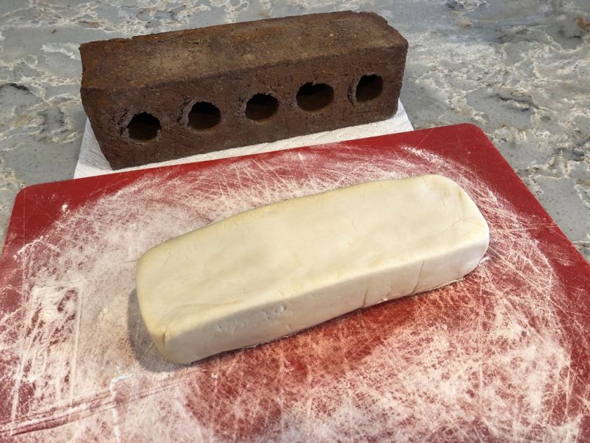 - Form the dough into an 8 inch long brick shape on a floured surface. Wrap dough in plastic wrap.