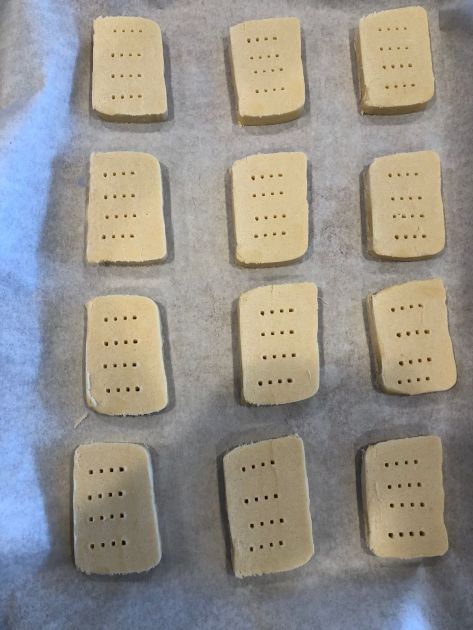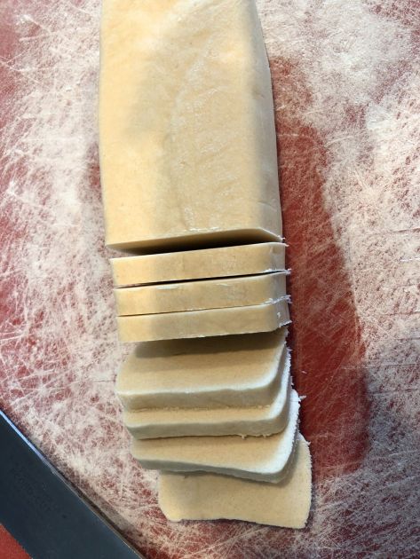 - Slice the dough brick, make 20 cookies about 3/8″ thick.