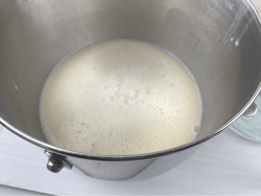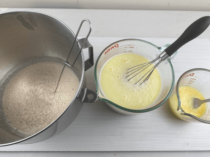 - POUR the milk and egg mixture into the yeast and water and stir to combine.