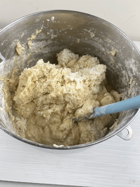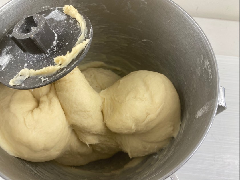 - MIX with the dough hook and the electric mixer. The dough should be soft but slightly tacky. It should have enough form to pull away from the sides of the bowl. Add more flour if necessary.
