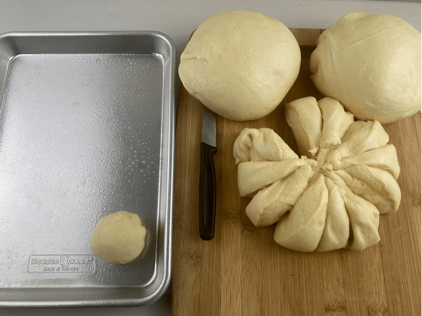 - COAT 1 or 2 baking sheets with non-stick baking spray. (1 pan if you desire rolls close together or 2 pans if round rolls are desired).