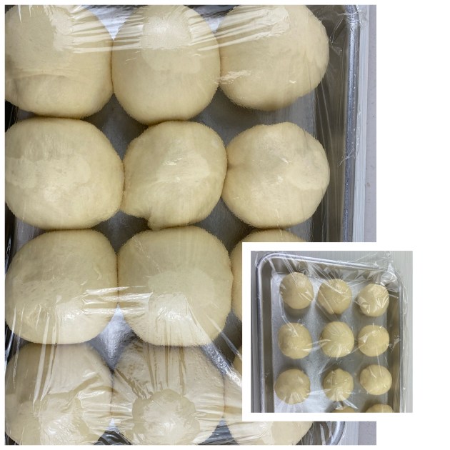 - COVER the dough with a piece of plastic wrap coated with non-stick spray. Let rise until double. OR eliminate the first rise and divide the dough in half then continue dividing to get 36 pieces.