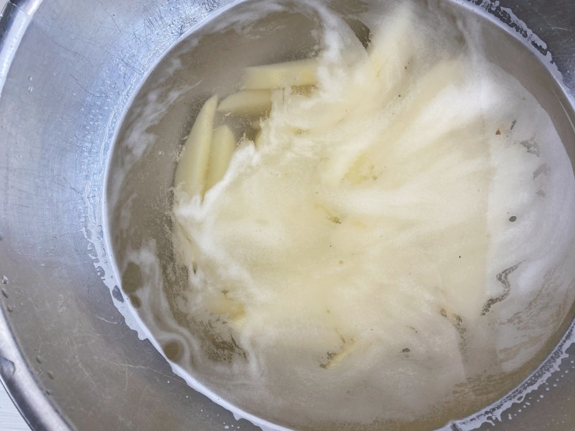 - PLACE the potatoes in a large bowl. Cover them in hot tap water and swish them for about a minute to release the starch from the potatoes.