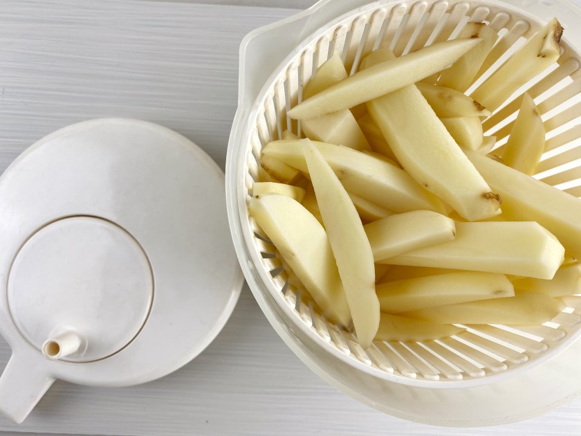 - 4-6 russet potatoes (about 4 to 8 ounces each) peeled, cut each potato cut lengthwise into evenly sized sticks and wedges