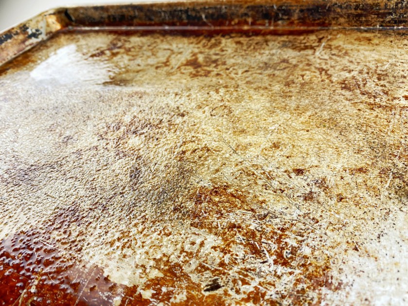 - MEASURE 3 Tablespoons of vegetable oil on the baking sheet. Tilt the sheet to cover it with oil, use a brush or paper towel to throughly coat the baking sheet.