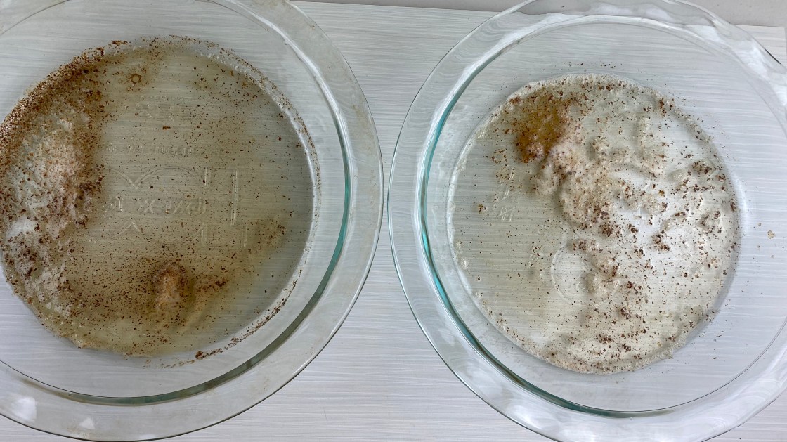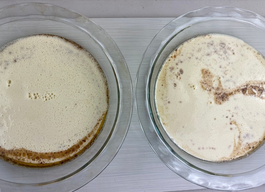 - CHECK the butter. When it is has melted and is almost brown, pour some batter into each pan.