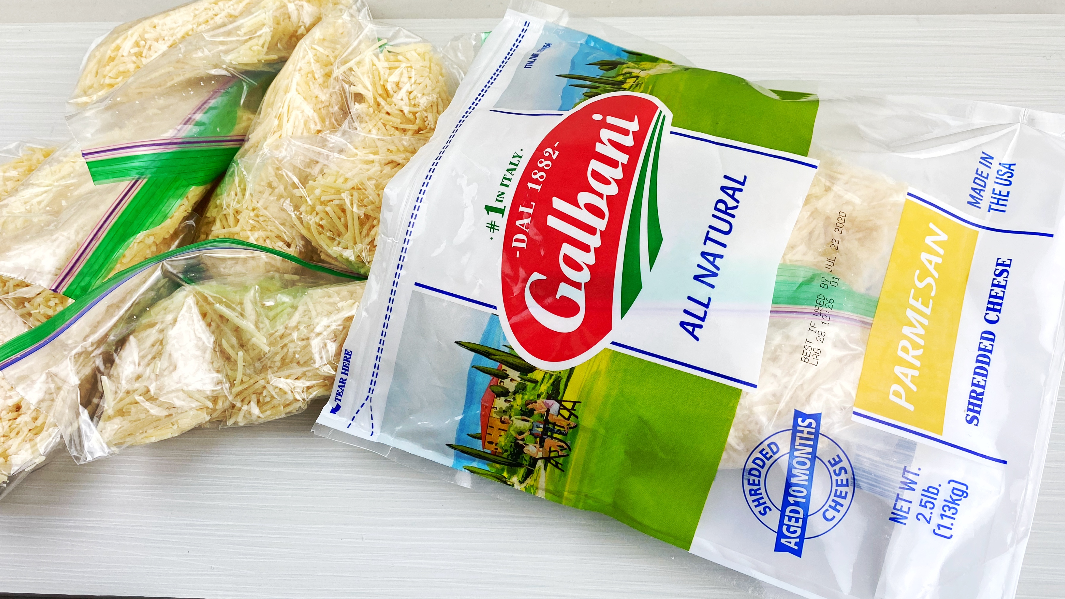 For the cheese, buy large bags of mozzarella and Parmesan cheese from Costco or Sam’s Club. Place 2-cup portions of mozzarella cheese into sandwich bags and 1-cup portions of Parmesan cheese into sandwich bags. Place the filled sandwich bags in the original large cheese bag or in gallon-size zip bags and freeze. Use one bag of each kind of cheese for each recipe of pizza dough (a 2 to 1 ration of mozzarella to Parmesan) To break the cheese apart, give the frozen bags of cheese a quick slam with a meat pounder.