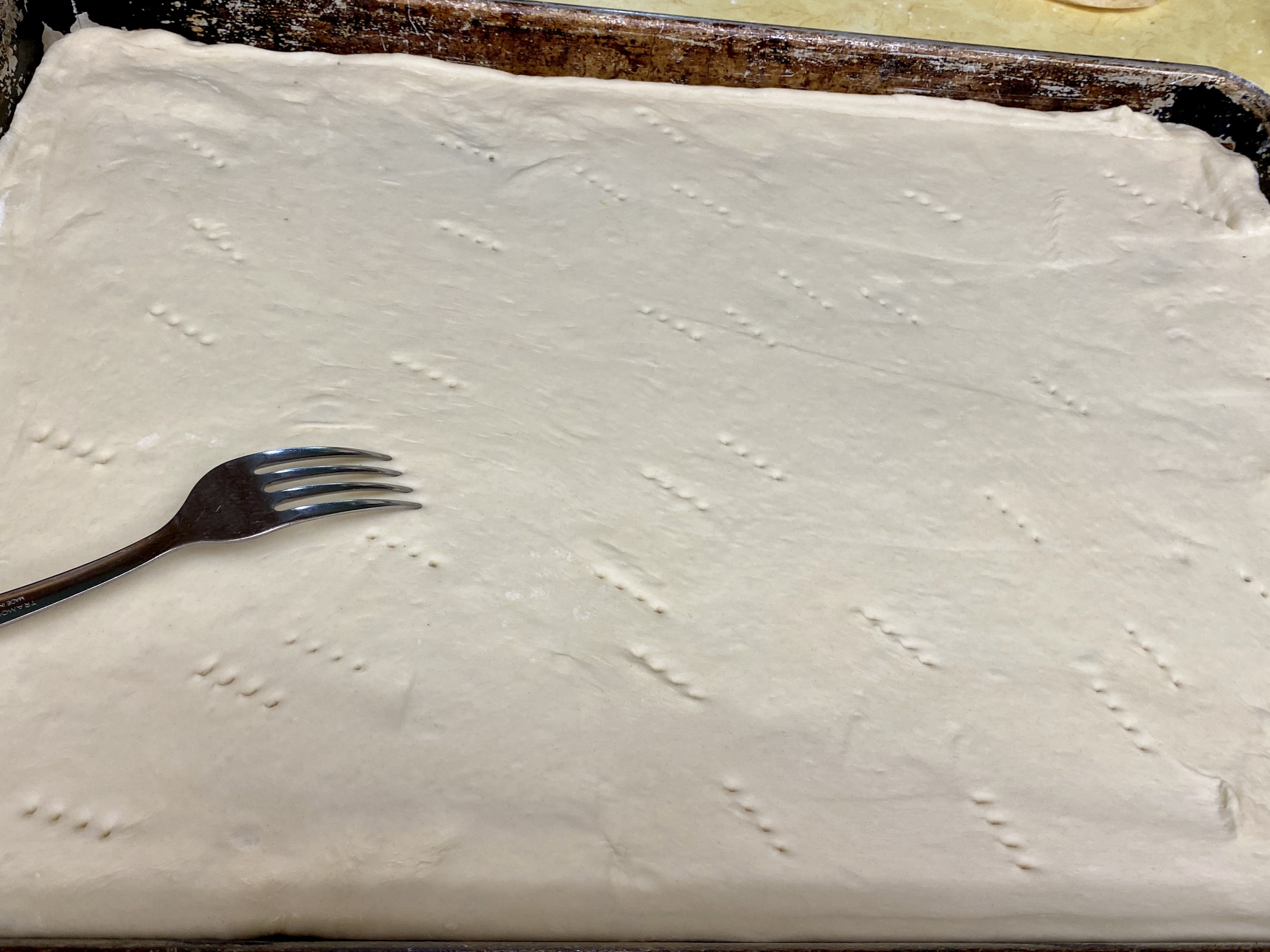 - ROLL OUT with a French rolling pin and place in pan. Poke the dough with a fork.