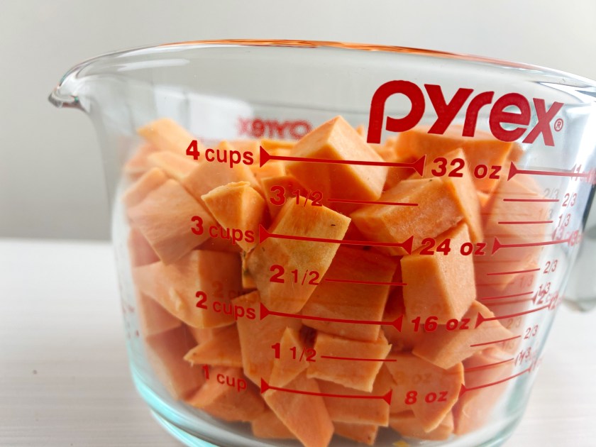 - 1-1/4 to 1-1/2 pounds sweet potatoes (3-4 medium size), peeled and cut into 2 inch pieces