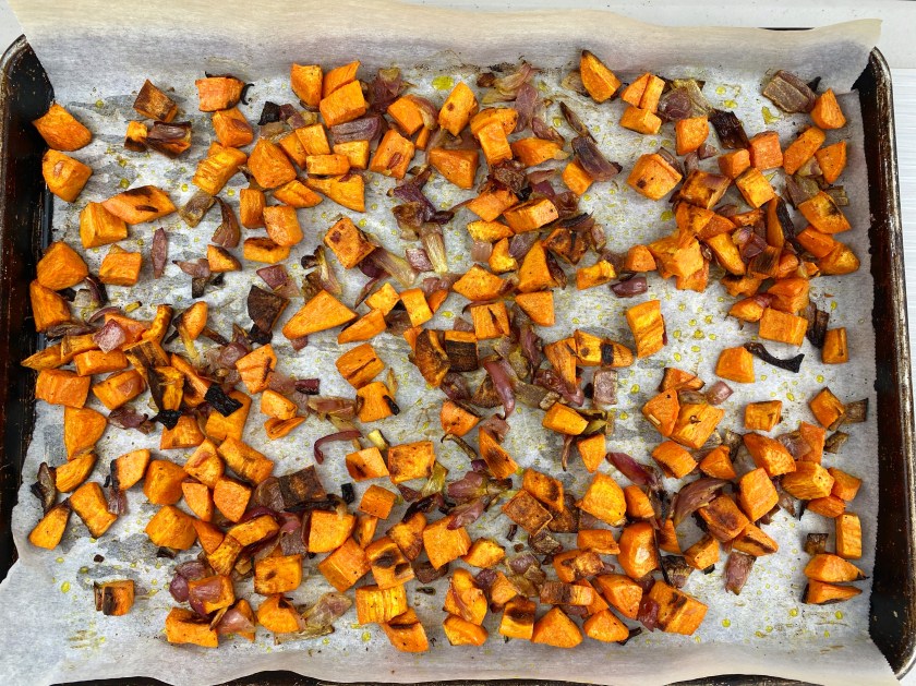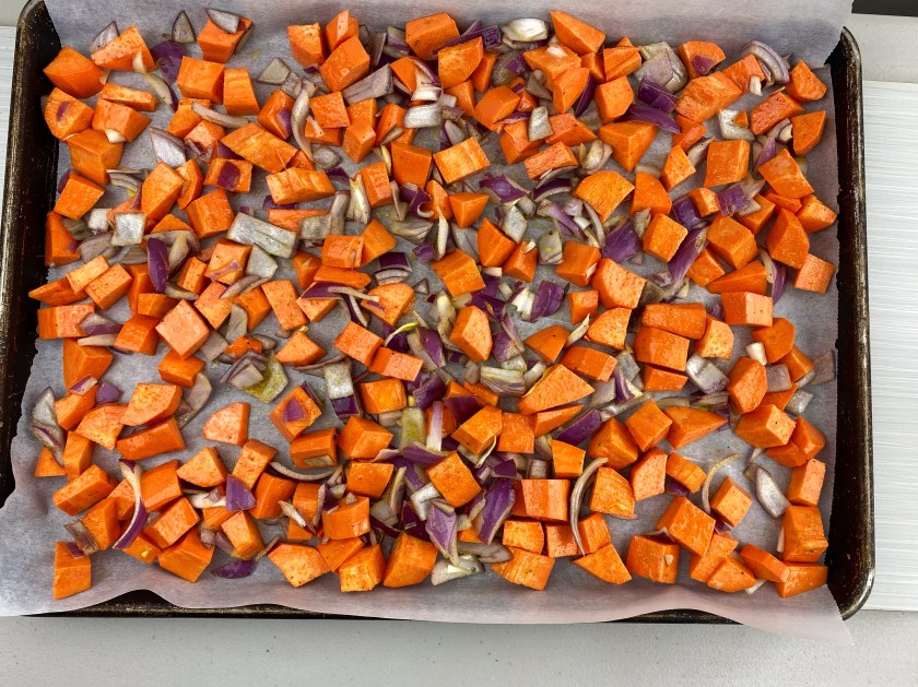 | Make ahead: Cut sweet potatoes can be stored in plastic bag and baked in a few days. Chop the onion just before baking. |