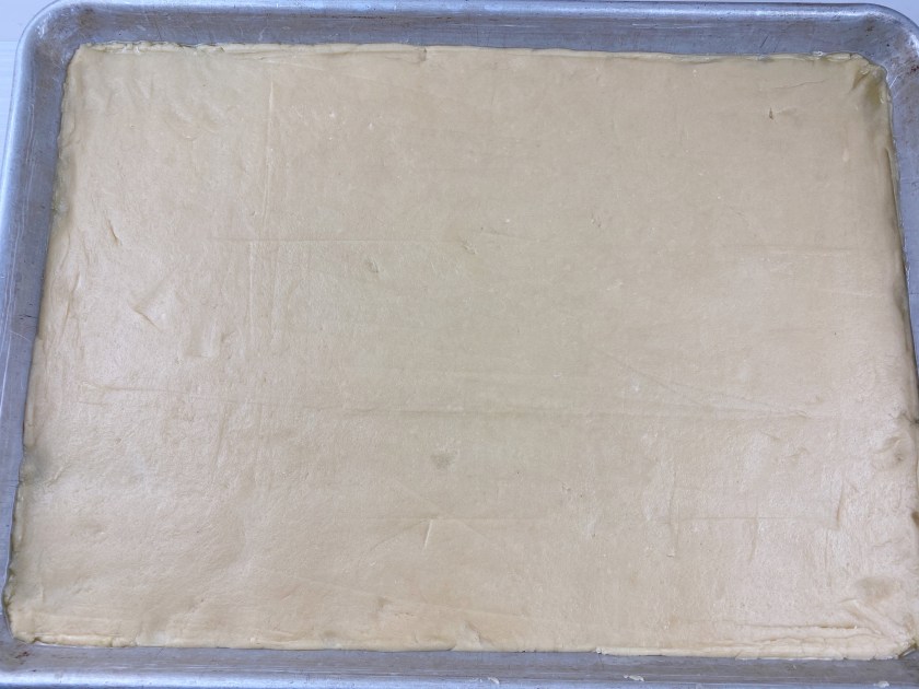 - MAKE an even layer of cookie dough by breaking off small cookie dough pieces into the prepared pan. Try to evenly cover the surface. Press the dough into the pan using wax or parchment paper coated with non-stick spray to prevent the dough from sticking to hands. A small rolling pin or even a can of non stick spray can be helpful.