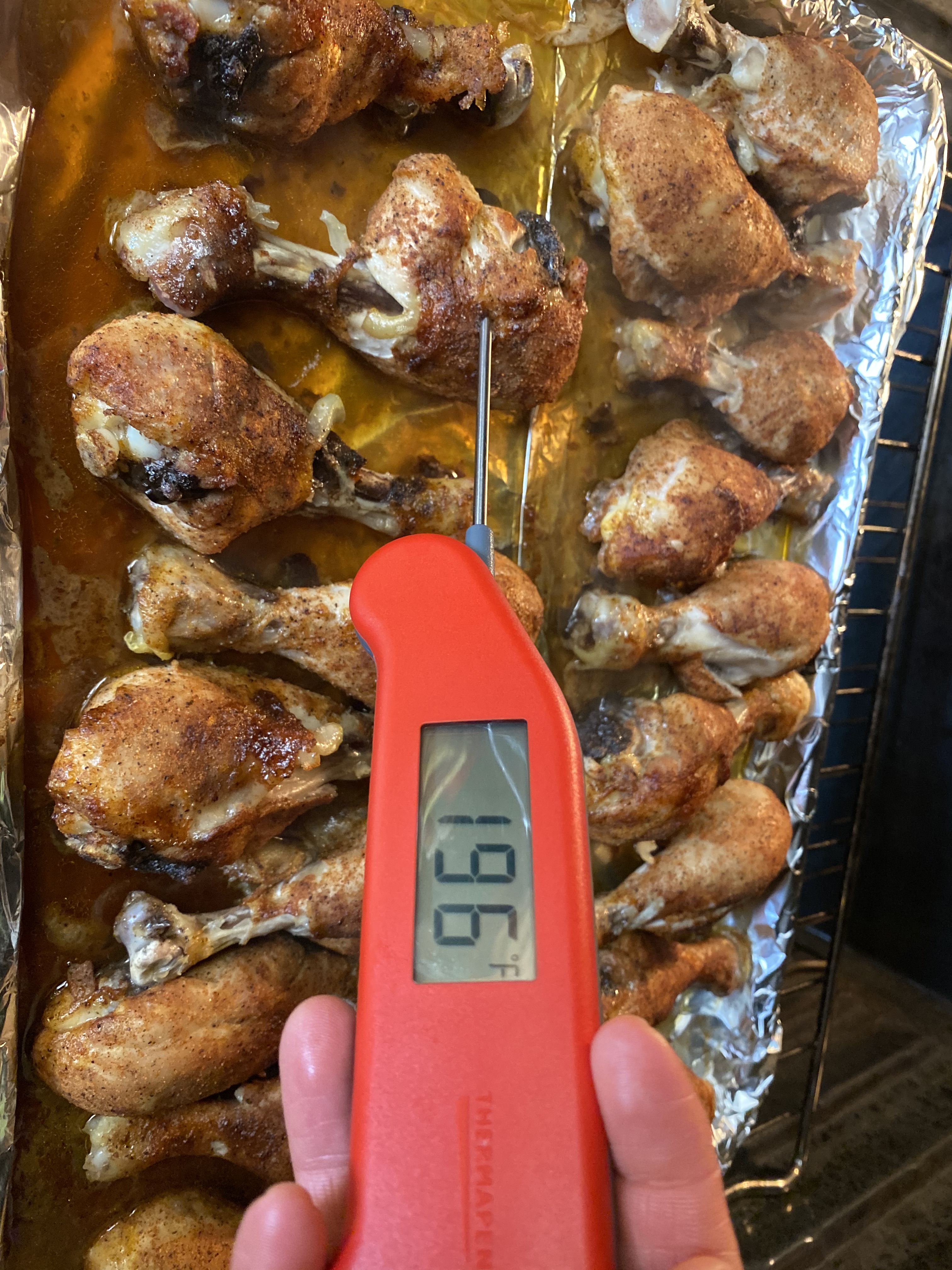 - BAKE for about an hour (until the drumsticks reach about 200 º).